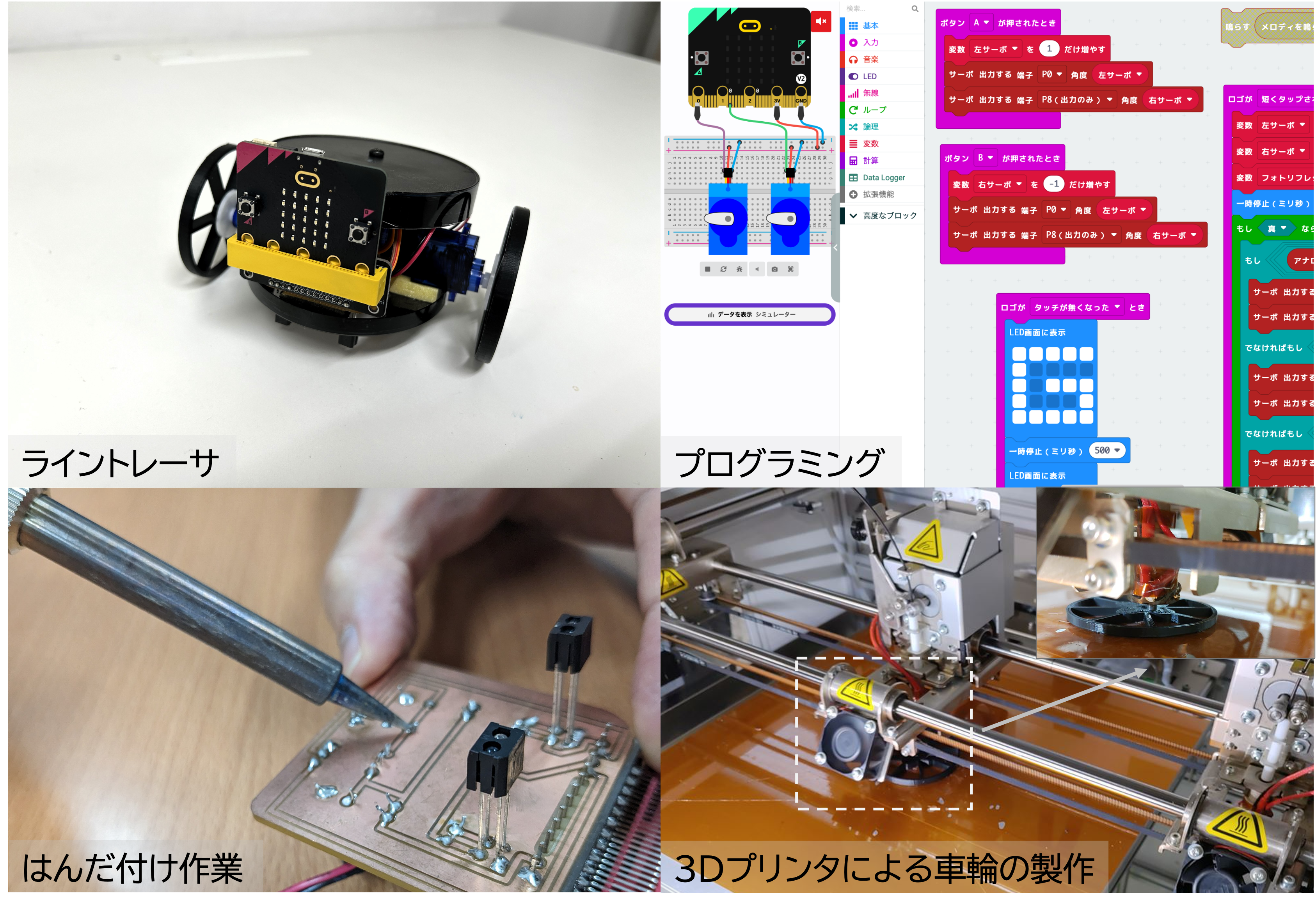 モータや電源、抵抗やコンデンサといった部品を組み込んだ電子回路工作を行い、micro:bitとプログラムを組み込んで、実際にライントレーサを走らせます。