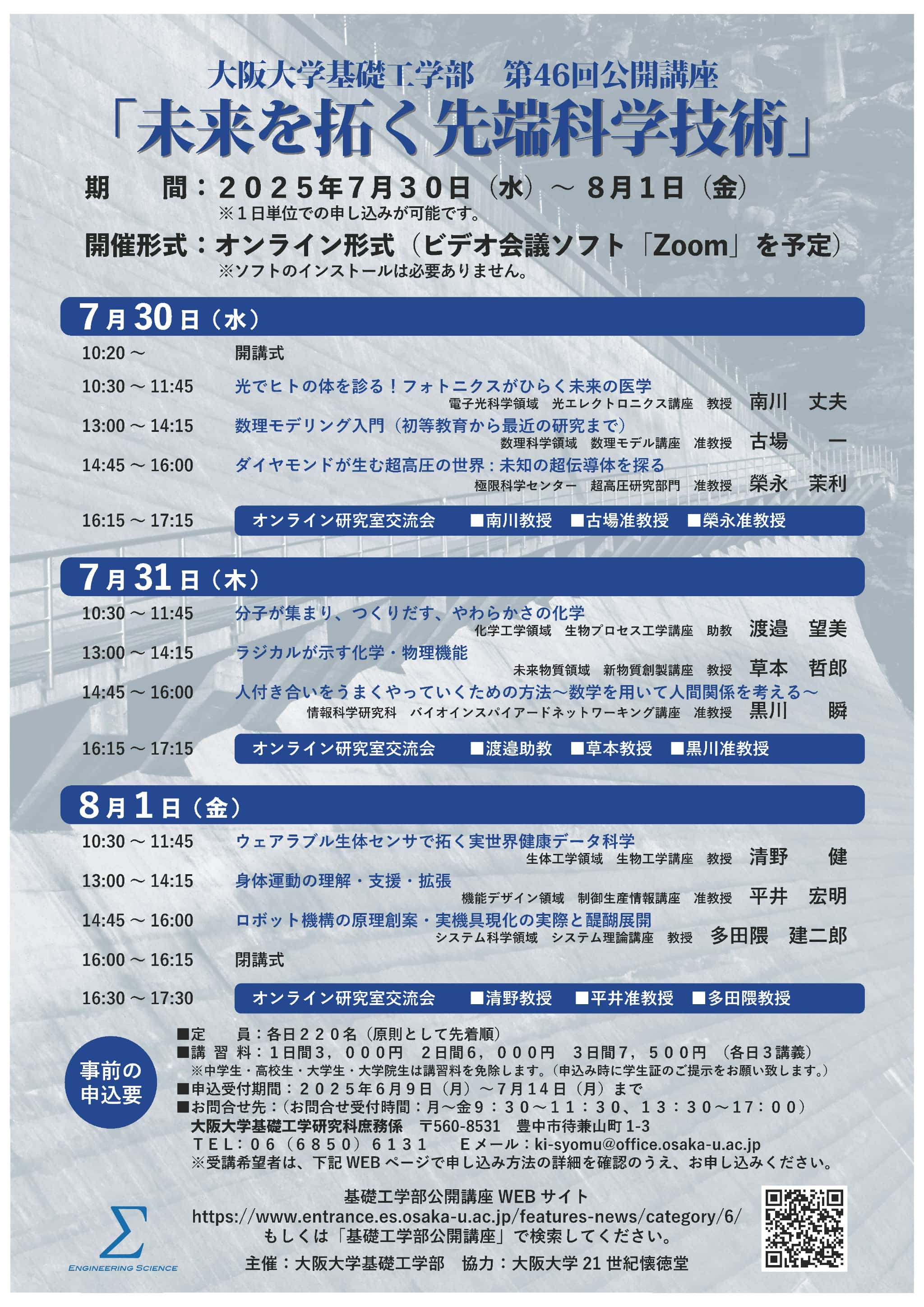 2025年7月30日(水)~8月1日(金)の3日間、オンライン形式にて基礎工学部公開講座「未来を拓く先端科学技術」を開催します。基礎工学部の教員が、一般の方を対象に、未来を拓く最先端の科学技術の成果とその意義を講義形式でわかりやすくご紹介します。3日間の講座ですが、希望する1日のみ受講することも可能です。大学の講義を体験してみたい意欲ある中学生・高校生の受講も歓迎いたします。